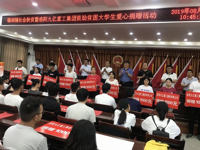 愛是與生俱來的,在血液里流動,在骨子里結(jié)晶,它源源不斷的由心而生,永不枯竭,只要人人都愿意奉獻(xiàn)一點(diǎn)愛,就如甘霖沐浴大地,人間處處盛開幸福之花! 為響應(yīng)洛陽市政府精準(zhǔn)扶貧政策,洛陽九億重工集團(tuán)有限公司及董事長王九茂積極參與捐資助學(xué)的慈善義舉活動,特做出如下決定:1、公司幫扶磁澗鎮(zhèn)2017年新招貧困大學(xué)生21名順利入學(xué),每人資助2000元,總計肆萬貳仟元整; 2、總經(jīng)理王九茂(縣政協(xié)委員)以個人名義資助磁澗鎮(zhèn)南窯村2017年新招大學(xué)生6名,總計12000元整; 我相信,在社會各界的大力支持和共同努力下,我們的“愛心助學(xué)”活動將會惠及到更多的同學(xué),為了夢想,刻苦讀書、報銷祖國,廣大同學(xué)也一定會在溫暖的社會大家庭里茁壯成長,必將成為國家建設(shè)的有用之才! 洛陽九億重工集團(tuán)有限公司 董事長:王九茂